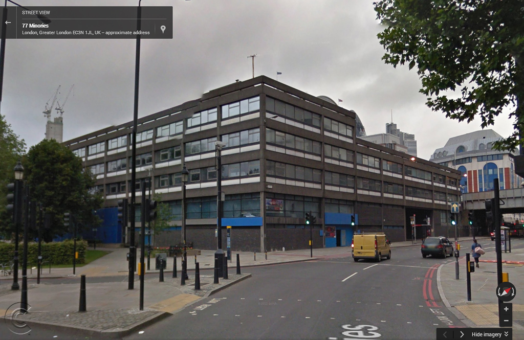 Since this post was written in 2014, demolition of the old building shown in the Google Streetview photos in the post has taken place, and construction of the The Grange Hotel at 100 Minories is all but complete. As I write these notes at the very end of November 2019, the hotel looks days / weeks away from opening. The ground floor is fitted out as a cafe and restaurant, and most all of the hoarding and scaffolding has been removed.